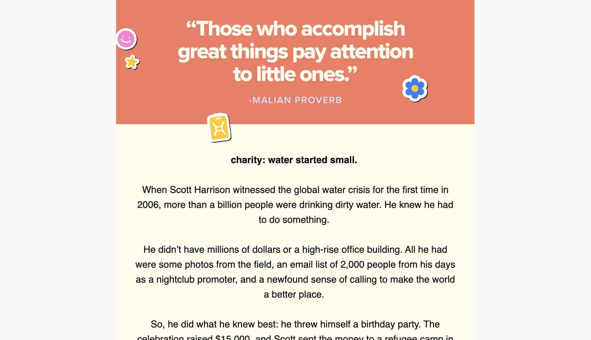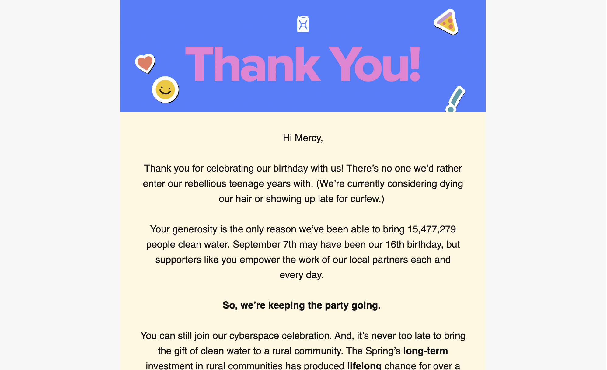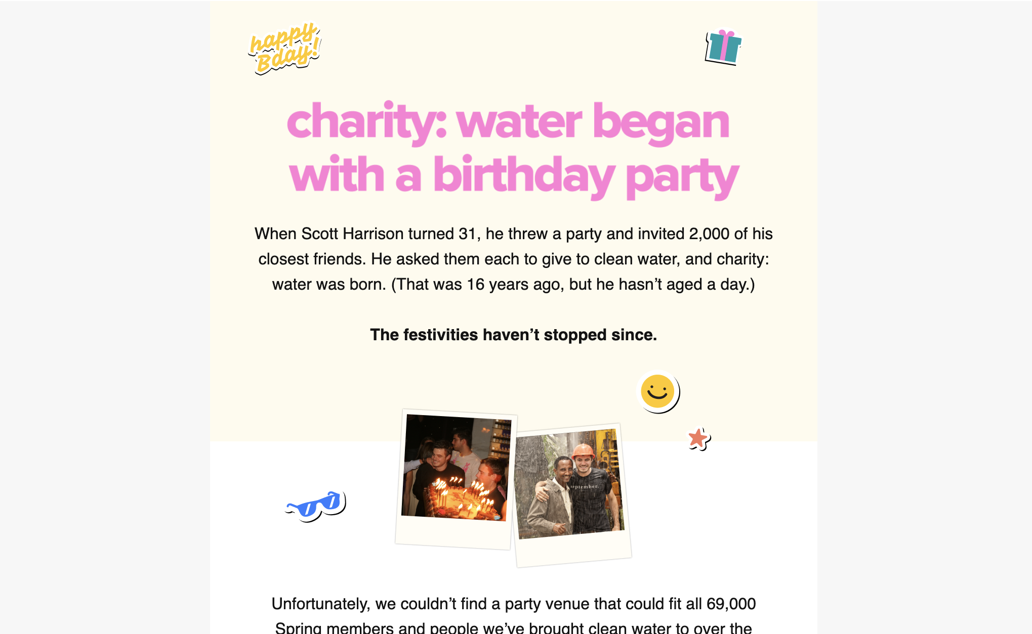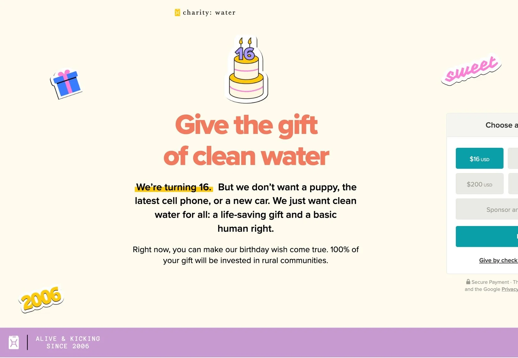 We decided to celebrate charity: water’s 16th birthday with a Sweet Sixteen party for the ages. Design and copy collaborated to create a campaign catered to Y2K nostalgia — honoring our ‘06 origins — and even included a Spotify playlist.